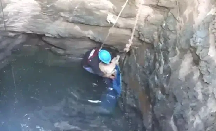 The rescue team knew that time was of the essence, and they worked swiftly. One of the rescuers descended into the well, taking great care to approach the dog with calm and reassurance. The dog swam around him in circles, still uncertain but understanding that help was near.