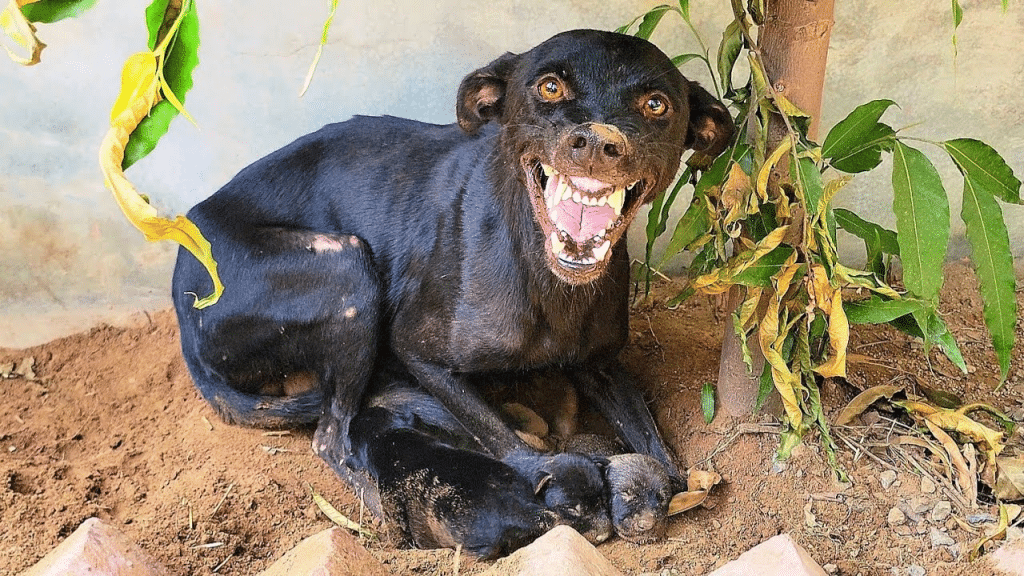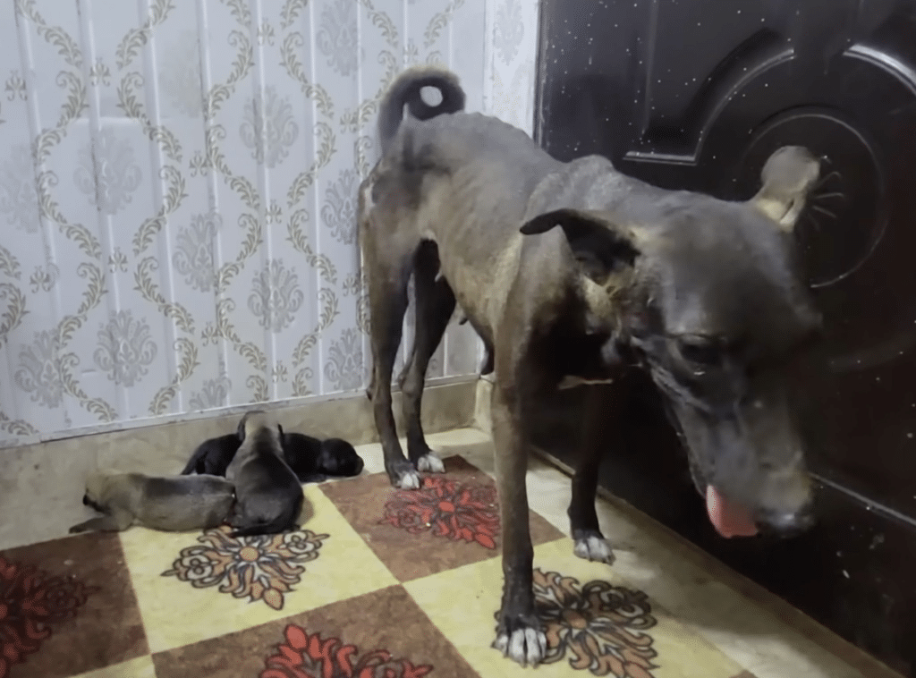 Standing in the shade, guarding a fragile cluster of newborn puppies, was a mother dog who looked completely spent. Her body was painfully thin, her ribs visible with every shallow breath. Her fur was matted and dull, clinging to her exhausted frame. Yet despite her weakness, she stood firm—positioning herself between the strangers and her babies.
