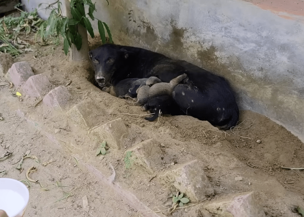 The puppies were impossibly small—only days old—curled together in a shallow patch of dirt that offered no real protection from the world around them. There was no shelter from the sun, no clean water, no reliable food. Somehow, against every odd, the mother had kept them alive. But she was running out of time.