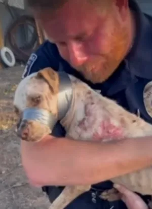 With hands trained for danger yet gentle by instinct, Hayes examined the tape. The dog’s breathing was obstructed, saliva seeping through the edges, evidence of hours or days spent unable to bark or whimper. Each second mattered now.