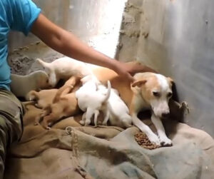 The local shopkeepers, who had been watching the small family from a distance, soon noticed the dark stains on the mother’s fur. They saw her suffering worsen and knew that without intervention, the six puppies would soon be orphans.