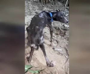 He was tied to a tree, unable to move freely, his body painfully thin from weeks without proper food or care. His strength was nearly gone. Every small movement looked exhausting, and his faint sounds reflected just how desperate his situation had become. It was clear that when the previous owners left, they had simply abandoned the dogs—leaving them behind in a place that offered no safety, no comfort, and no certainty.