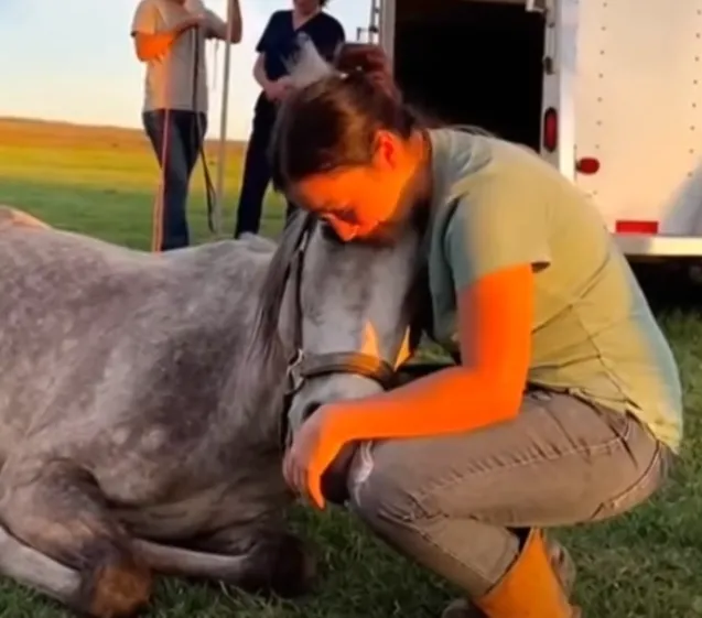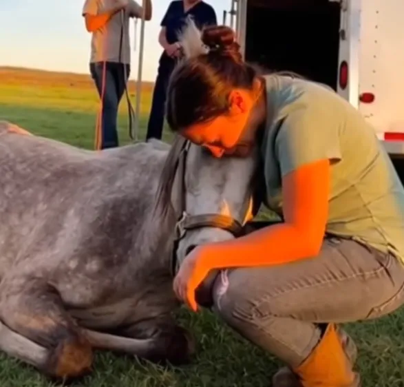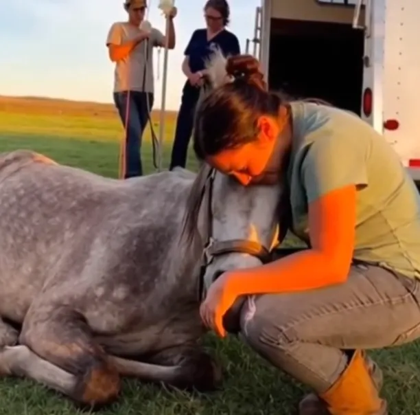She slid under Echo’s heavy head just before it hit the ground, cradling the mare’s jaw against her chest.
